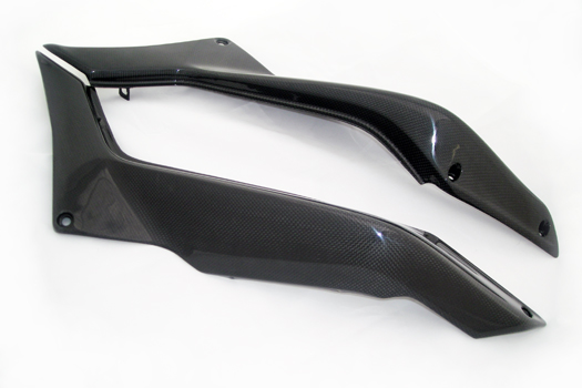 Carbon fiber underseat side strips L+R. "PLAIN" fabric (same Ducati Performance).  Replacing to the original. Wheigt: 262 Gr. Glossy surface finish.