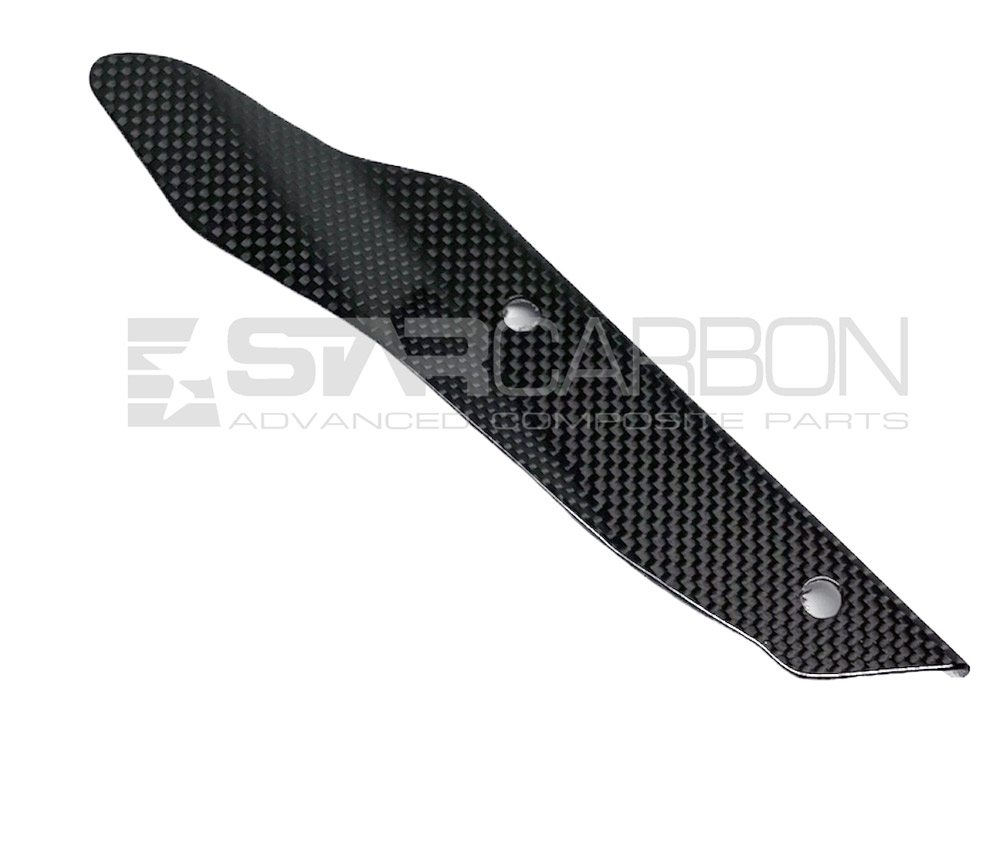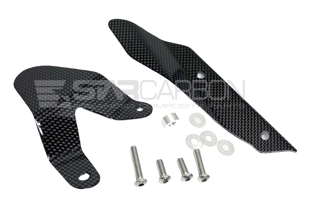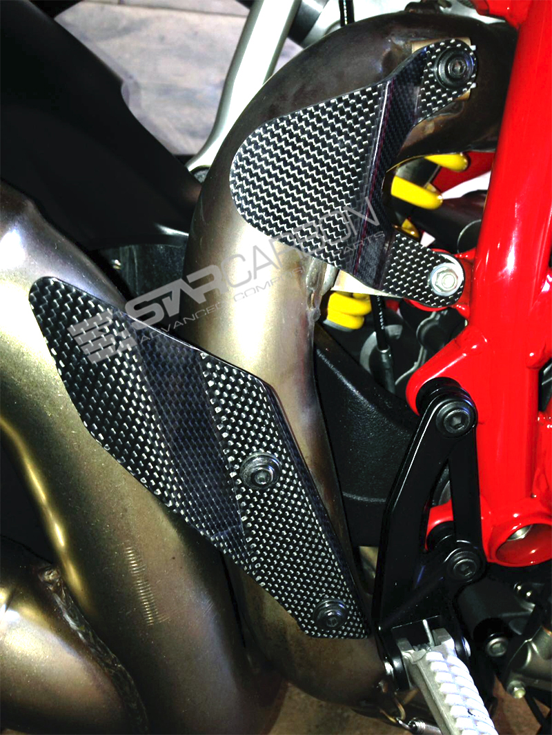 Paracalore + Paratacco pedana DX in fibra di carbonio. Trama "PLAIN" (la stessa dei pezzi Ducati Performance). Si sostituiscono al paracalore originale. I pezzi vengono forniti con kit di viteria per il montaggio. Finitura trasparente lucida anti UV. Peso: 20 gr.