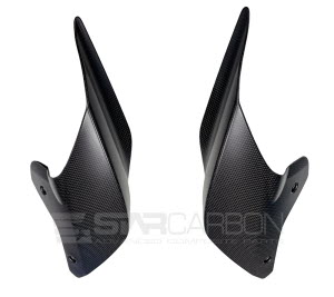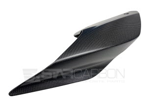 Fianchetti posteriori DX + SX in fibra di carbonio. Trama "PLAIN" (la stessa dei pezzi Ducati Performance). Si sostituiscono agli originali mantenedo le stesse viti di fissaggio. Finitura trasparente opaca anti UV. Peso: 135 gr.